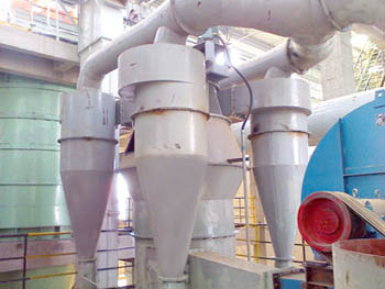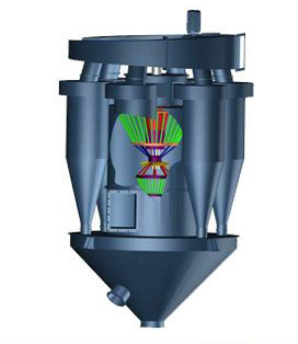 中粗粉和細(xì)粉通過大風(fēng)葉后,在上升氣流的作用下,繼續(xù)上升穿過立式導(dǎo)向葉片進(jìn)入二級選粉區(qū)。含塵氣流在旋轉(zhuǎn)的籠型轉(zhuǎn)子形成的強(qiáng)烈而穩(wěn)定的平面渦流作用下,使中粗粉在離心力的作用下被拋向立式導(dǎo)向葉片后失去動能,落到中粗粉收集錐中,通過中粗粉管排出。符合要求的細(xì)粉穿過籠型轉(zhuǎn)子進(jìn)入其內(nèi)部,隨循環(huán)風(fēng)進(jìn)入低阻型旋風(fēng)分離器中,隨后滑落到細(xì)粉收集錐內(nèi)成為成品。